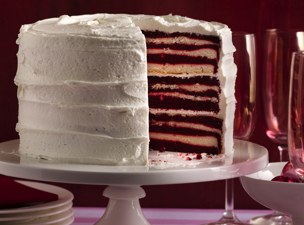 For next cake layer, spread 1/2 cup white batter evenly over each baked red velvet layer. Bake 8 to 10 minutes or until cake is set when lightly touched in center.