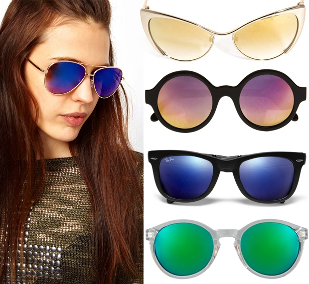 Aside from blue, other options to consider are green, yellow, metallic gold, pink or even reflective dark/black lenses. Mirrored lenses can work in any given shape and style, too, so just go for what best suits your face shape and wardrobe.