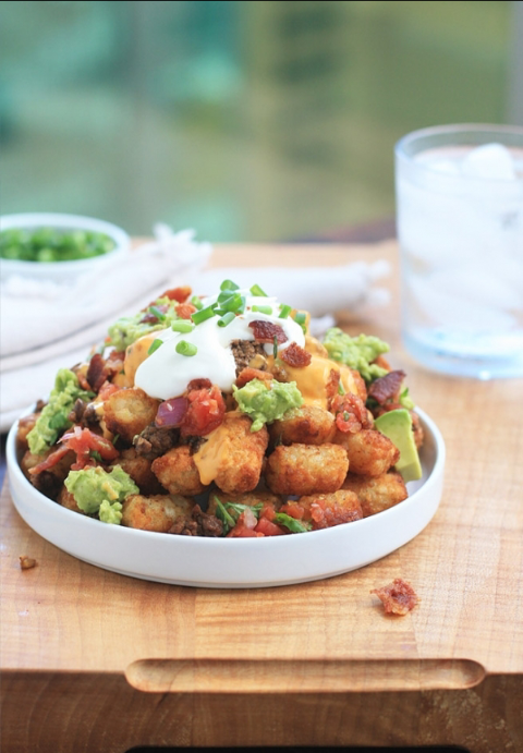 Preheat the broiler to high heat. Chop one tomato and season with salt and pepper. Drain the tomato and set aside. Cut the remaining tomatoes in half and pile on a baking sheet. Top with the garlic, onion and jalapeno. Broil 25 minutes, then transfer to the blender and add 1 ½ cups cilantro and the lime juice. Blend until smooth, season with salt and pepper and set aside. Cook the chorizo for about 4 minutes, or until browned. Drain. Heat the oil and fry the tater tots, seasoning with salt when cooked. Place half the tots on a platter and top with half the salsa, cheese, chorizo, tomatoes, onions, scallions and remaining cilantro. Top with another layer and serve.