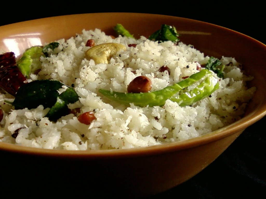 Next, add in the coconut to the kadai and mix them all together. Care should be taken to avoid any moisture remaining in the mixture, therefore keep stirring it properly until all the water in the coconut evaporates. At this stage, add in the required quantity of salt and stir again.Now, take the cooked rice that is to be added. Add a tablespoon of coconut oil to it to separate the grains of the rice.