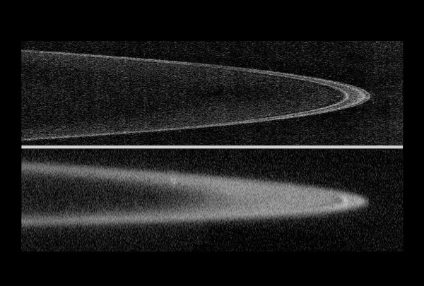 LORRI images of Jupiter’s Rings.The top image was taken on Approach to Jupiter while the bottom image was taken on departure illuminated by the sun.