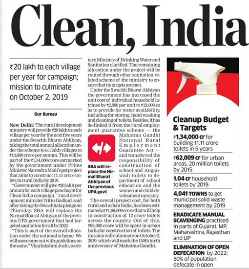 Targets & budgets for ~ 1.34 cr for 11.1 cr toilets ~ 20 lacs to each Village ~1.04 cr Toilets by 2019