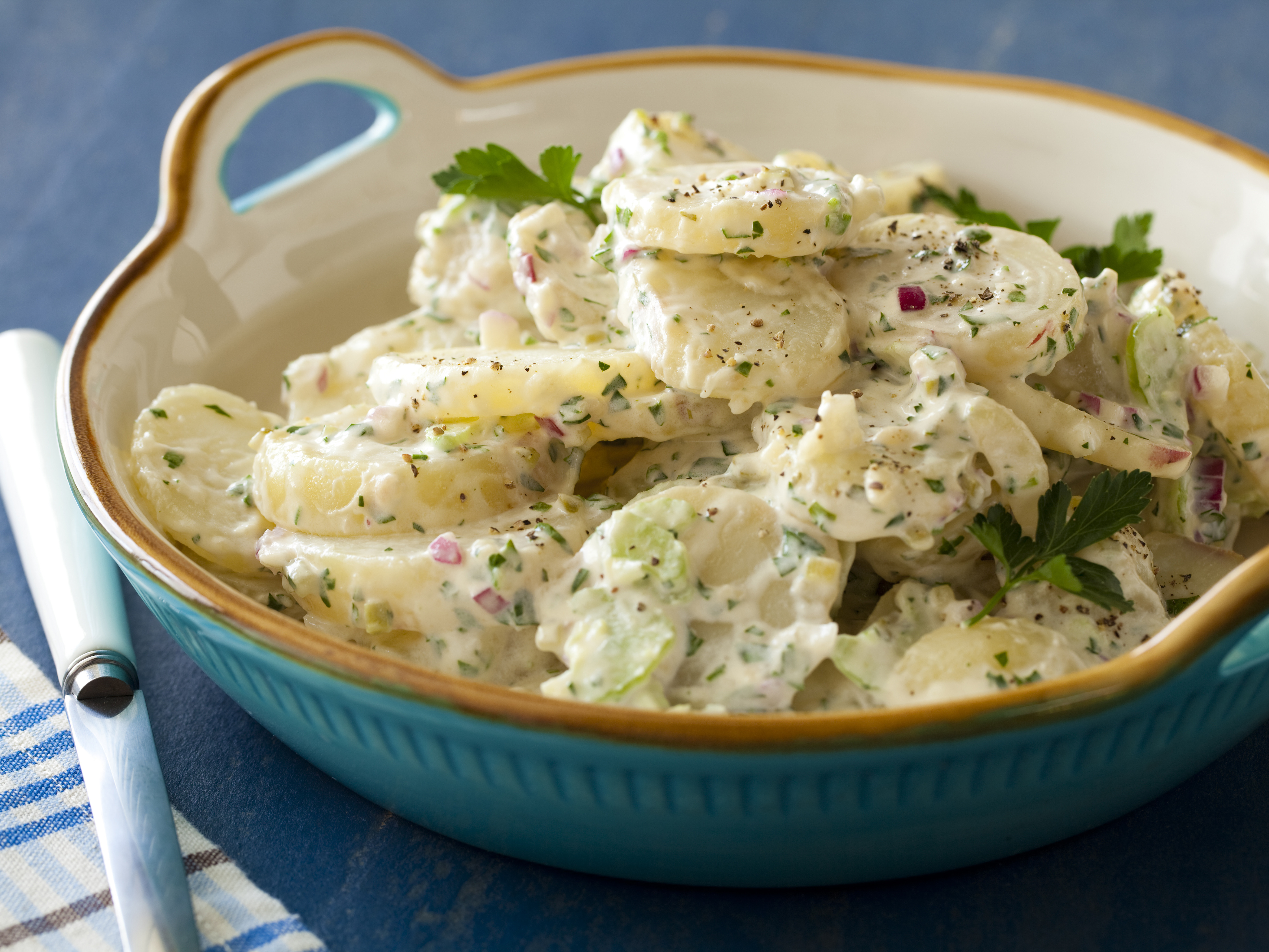 Combine the mayonnaise and ground mustard. Then add the parsley and tarragon and combine thoroughly. Add the garlic, red onion, and celery. Finally, add the potatoes and mix until completely coated. Add cracked pepper and kosher salt to taste. Let potato salad chill in the refrigerator for at least 1 hour before serving.