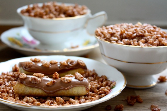 Pipe with cooled crème pat then swirl melted chocolate over the top and sprinkle with coco pops.