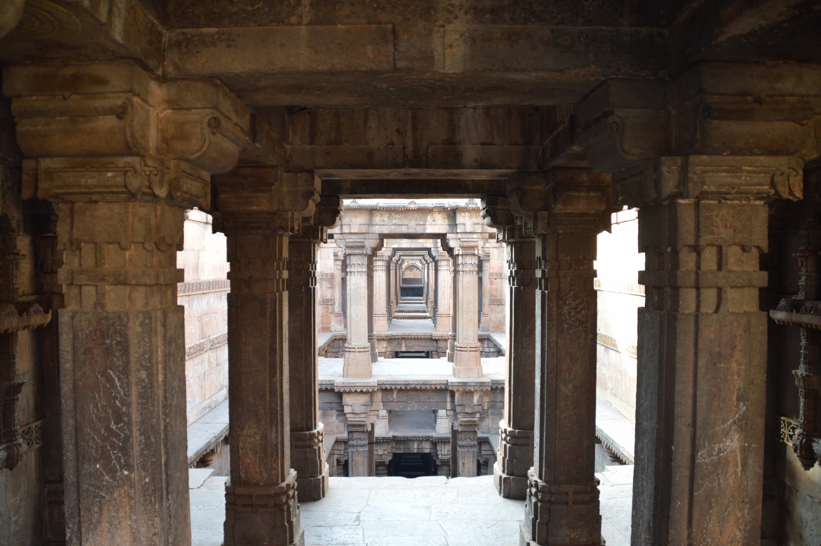 In the Asarwa village, northeast of the walled its between a sleepy residential area and the coal yards of Ahmedabad on a little side street, one will find Dada Harir Vav. At ground level one may not see much, but as one step up to the top of the stairs, one suddenly sees a deep cascade of stairs and columns plunging down several stories, with shafts of light falling on beautiful carvings and birds and bats flitting in and out of the shadowy corners.