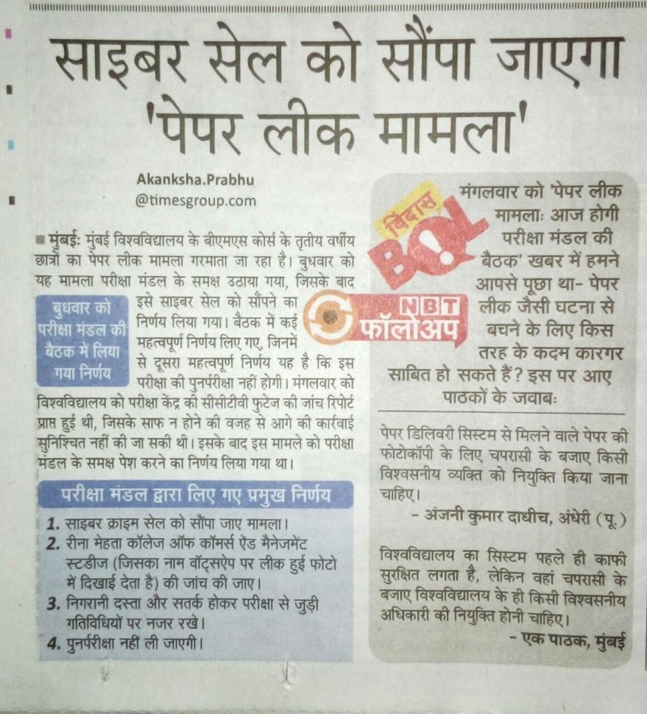 According to news published in timesgroup daily Hindi edition, the TYBMS SEM 6 Exams Paper Leak investigation has been handed over to the cyber crime department.
