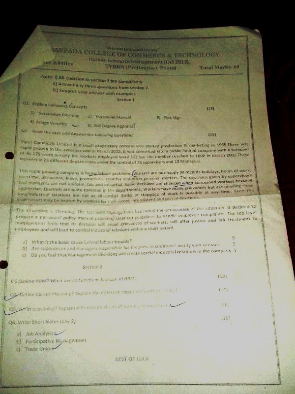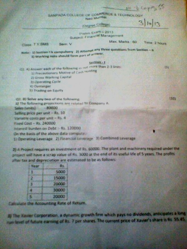Sanpada College TYBMS Sem 5 Prelims Question Papers 2013