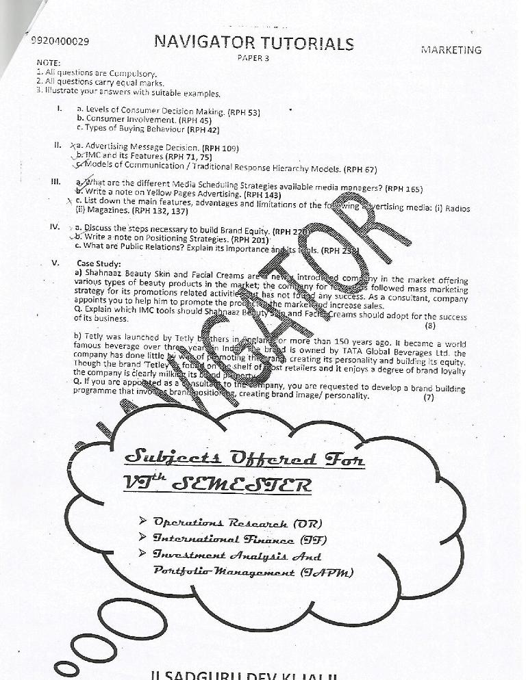 Below is the Prelims question paper / practice question paper for November 2014 TYBMS Sem 5 Exam of Special Studies in Marketing.