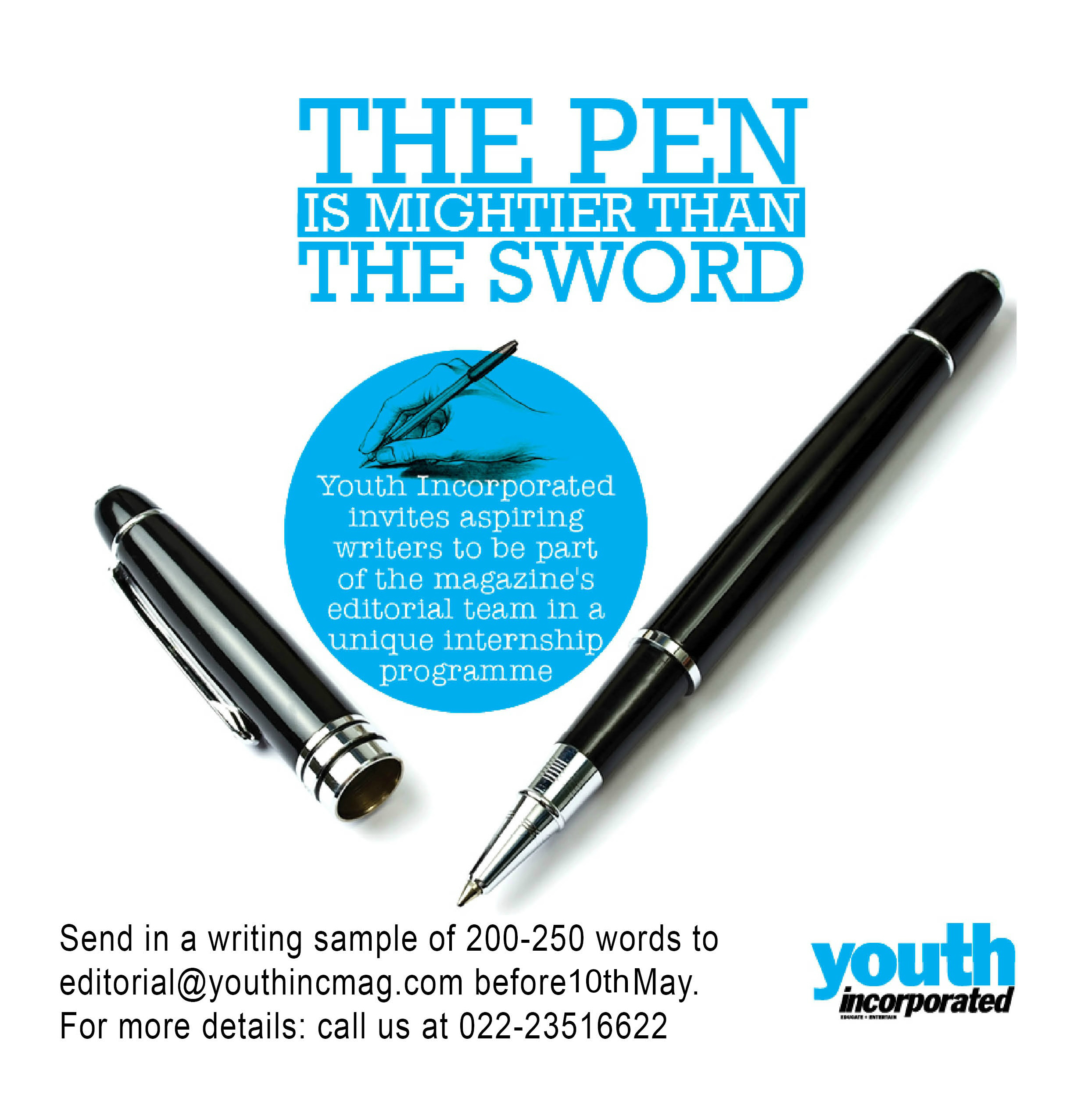 Every year Youth Incorporated invites young writers to be a part of the Junior Editorial Board (JEB) an internship programme from 20th May to 20th June in which chosen Junior Editors help put together the ANNIVERSARY issue of the magazine. The JEB members will work on the entire issue right from concept to design and print. They will be featured in the magazine as well as get a certificate at the end of the internship.