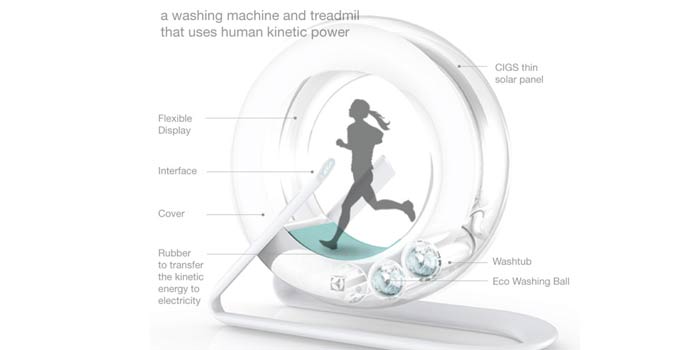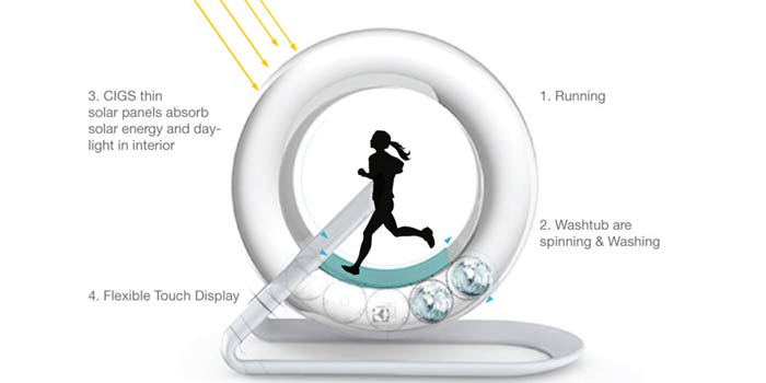Inside the tube, you’ll find the treadmill with a rubber layer which converts the kinetic energy into electricity. Fitted within the body is the washtub and the eco washing ball which not only speeds up the washing process, but also uses less water. Both components spin as you run and if there’s unused power, it can be stored for use at a later time when there’s no one around to run or you prefer doing the laundry with leisure. On the outside, there’s an interface which provides data such as running speed, and a flexible display is positioned at the front of the runner. Lastly, a solar panel covers the top and sides.