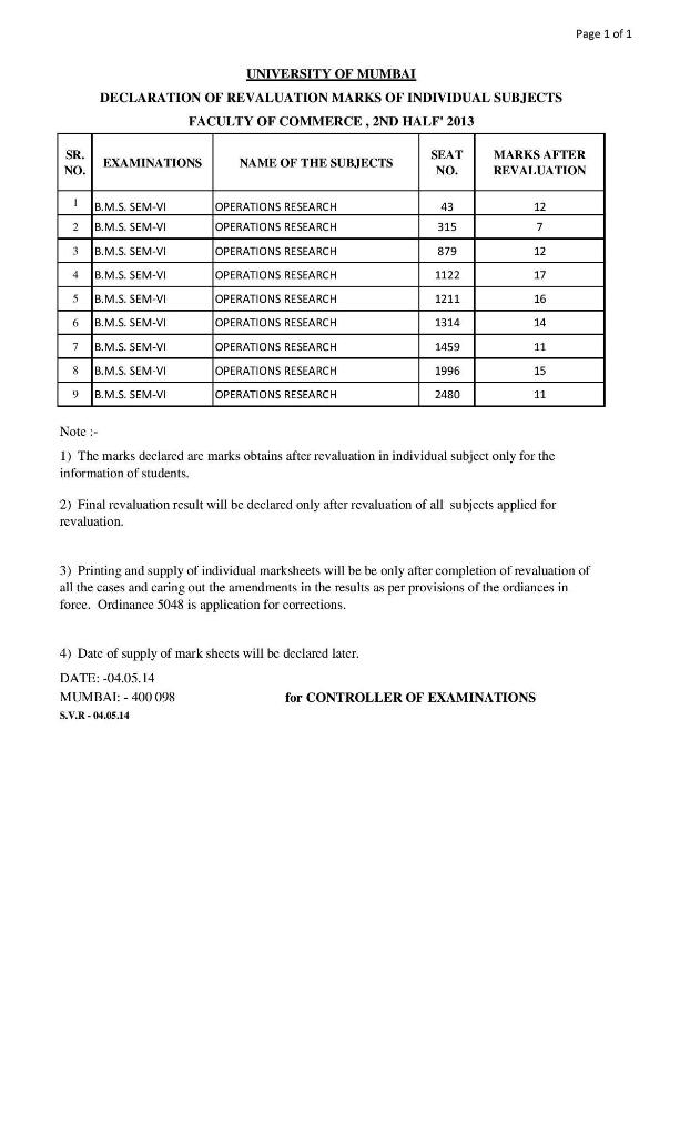 Mumbai University has declared the list of revaluation results for Sem 6 ATKT 2013 exams.
